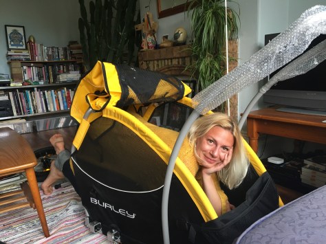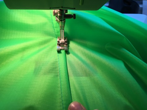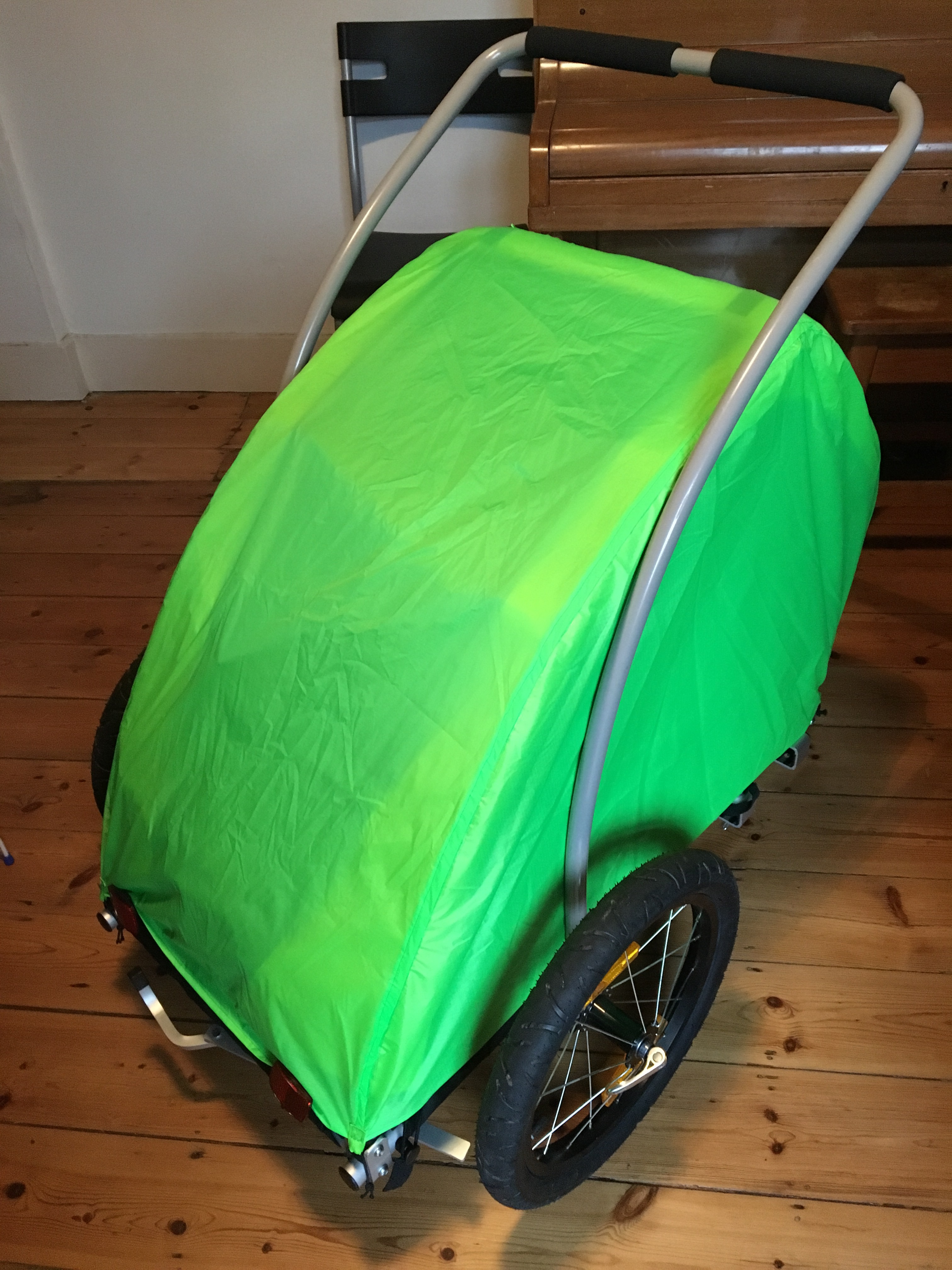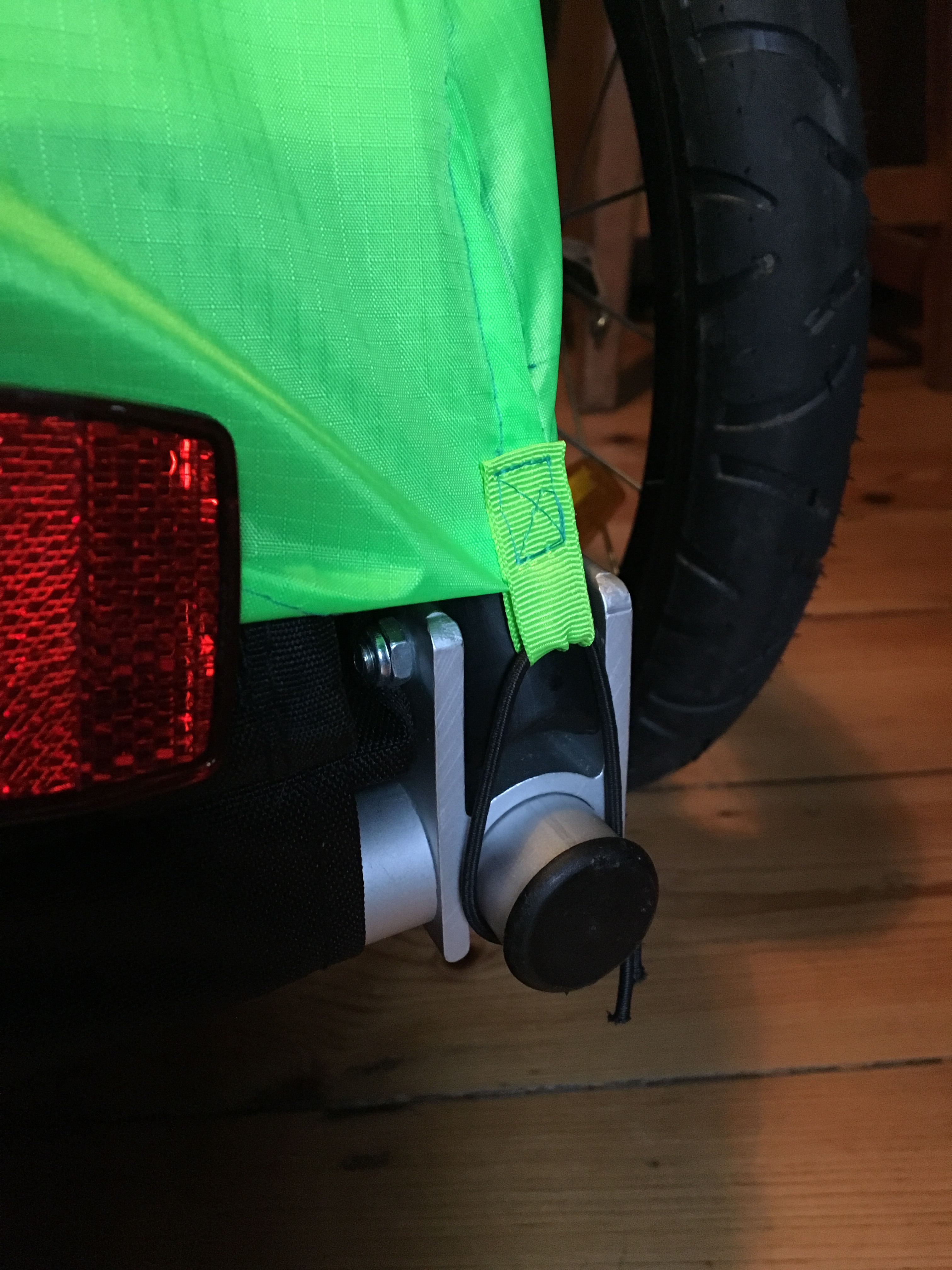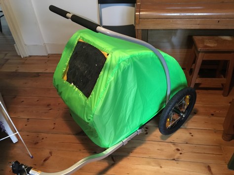 I used bright green Nylon Ripstop from my local material place, did sort of foldy over waterproof seams (which I will seal with heat sealing tape when I have some) and used shock cord and webbing to make fastening loops. I also put a window in so Scout can look at me from her snug, waterproof throne as I pedal through the driving rain. Hmmmm.
