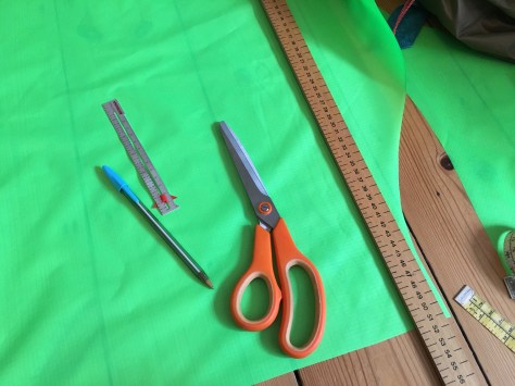 Since getting him home I’ve sprayed him with some NikWax waterproofing potion and sewn him a fetching green coat so that overnight showers and rainy days won’t bother us. (Wet dog in a tent anyone? No thanks.)